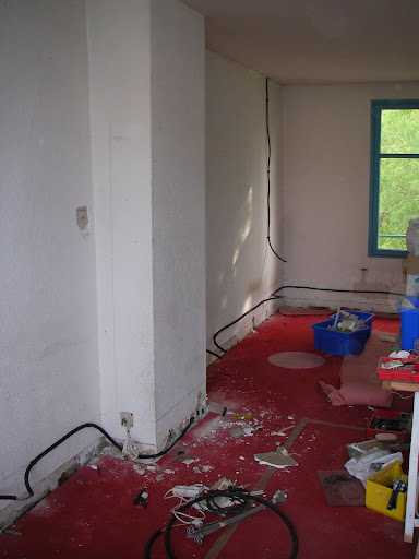 Pour les prises des chambres, étant donné qu'on double toutes les cloisons donnant sur l'extérieur, je passe les gaines dans ce doublage, sauf sur la cheminée ci-dessus ou Johan nous a fait une très belles saignée art déco pour passer la gaine... ça sera de toute façon dans un placard ;-)